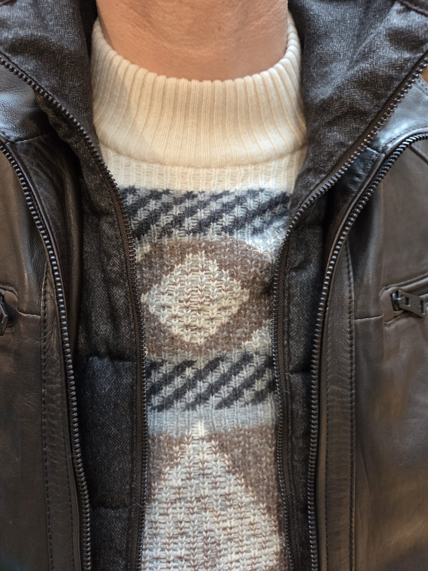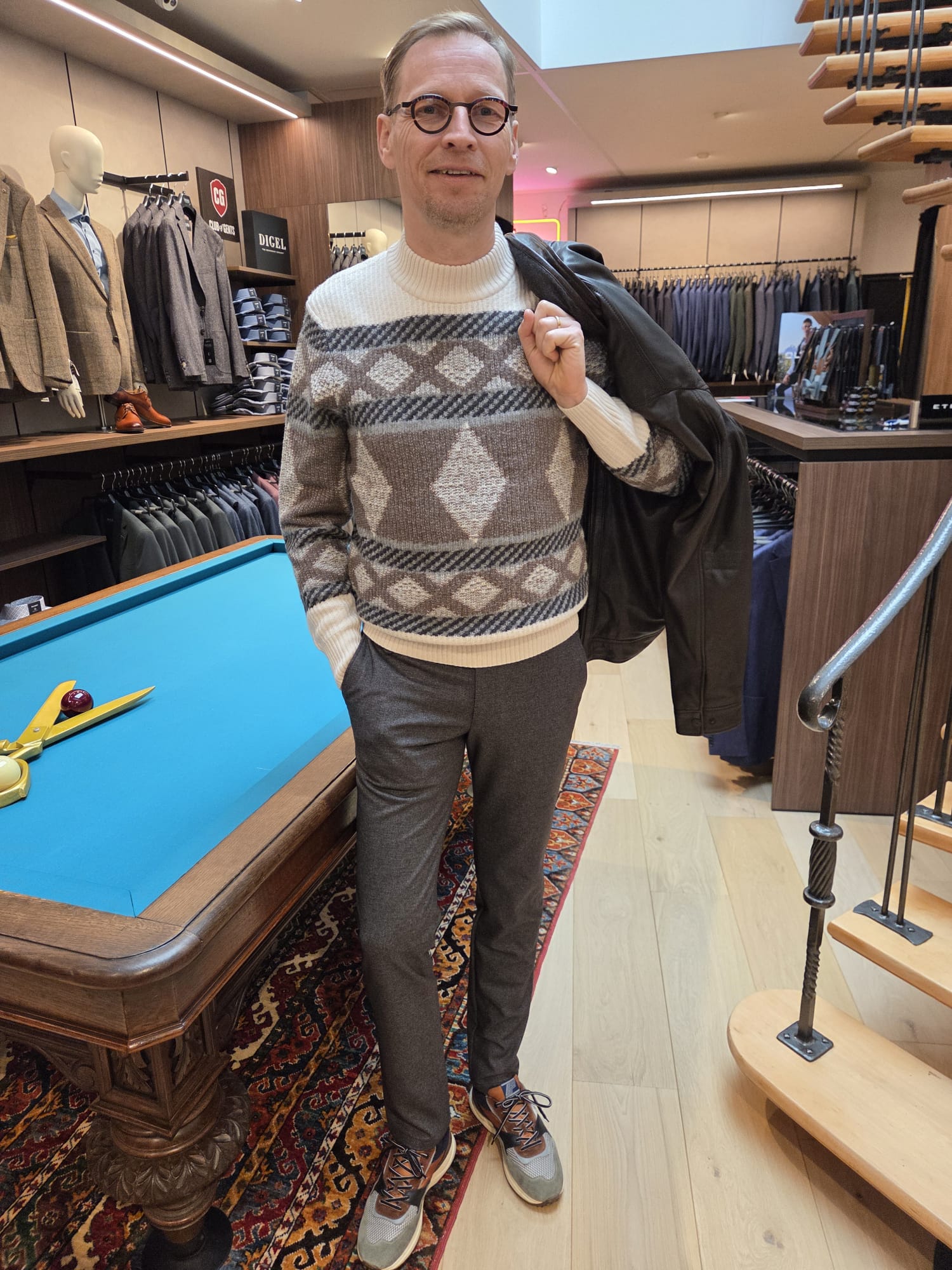 Deze gebreide trui met speelse, grafische retro-print van Bugatti (169,95) combineert leuk met de broek van Bugatti (115) en de lederen jas (met uitneembare windstopper) van DNR (319,95)