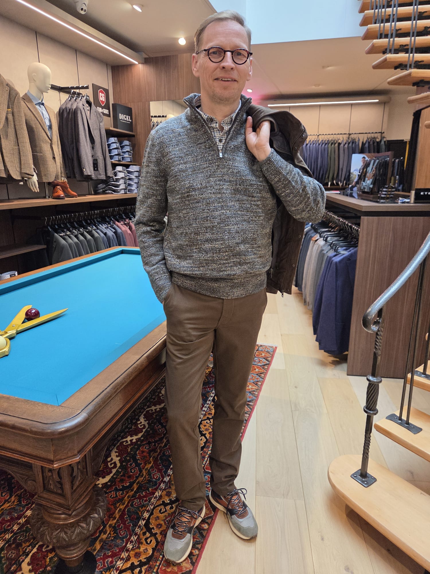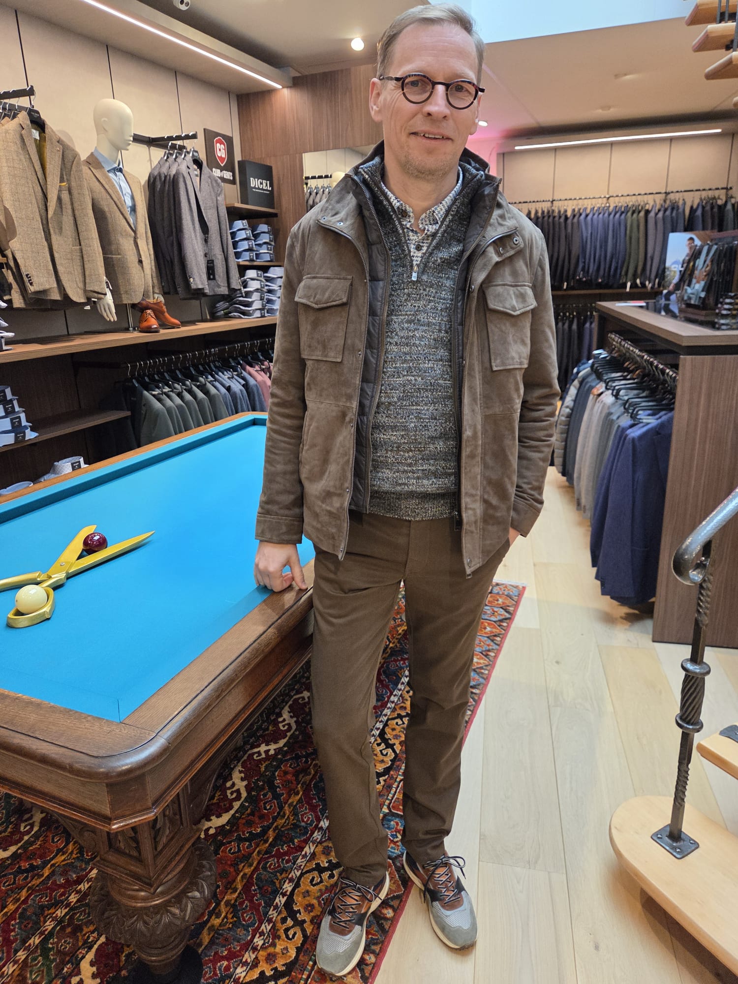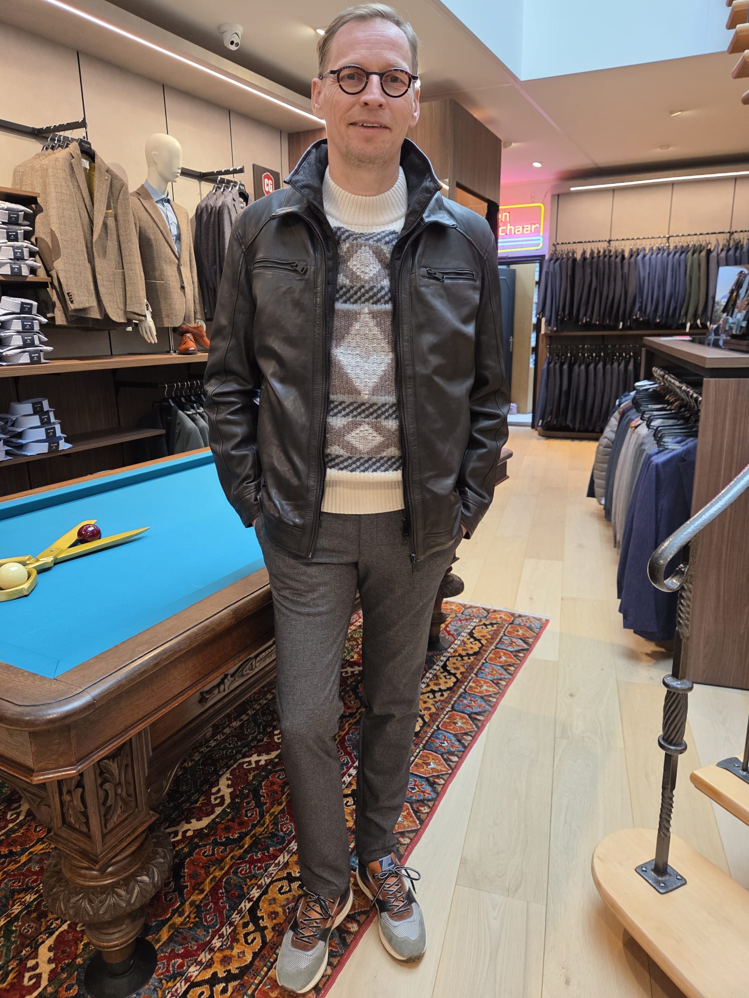 De gemêleerde (gespikkelde) trui met korte rits van State of Art (159,95) kan je dragen met een T-shirt, of zoals op de foto, met een hemd – hier van State of Art (89,95). De broek van M5 (119,95) in mooie bruine herfstkleur pas perfect bij de stoere daim-lederen jas van DNR (389,95).