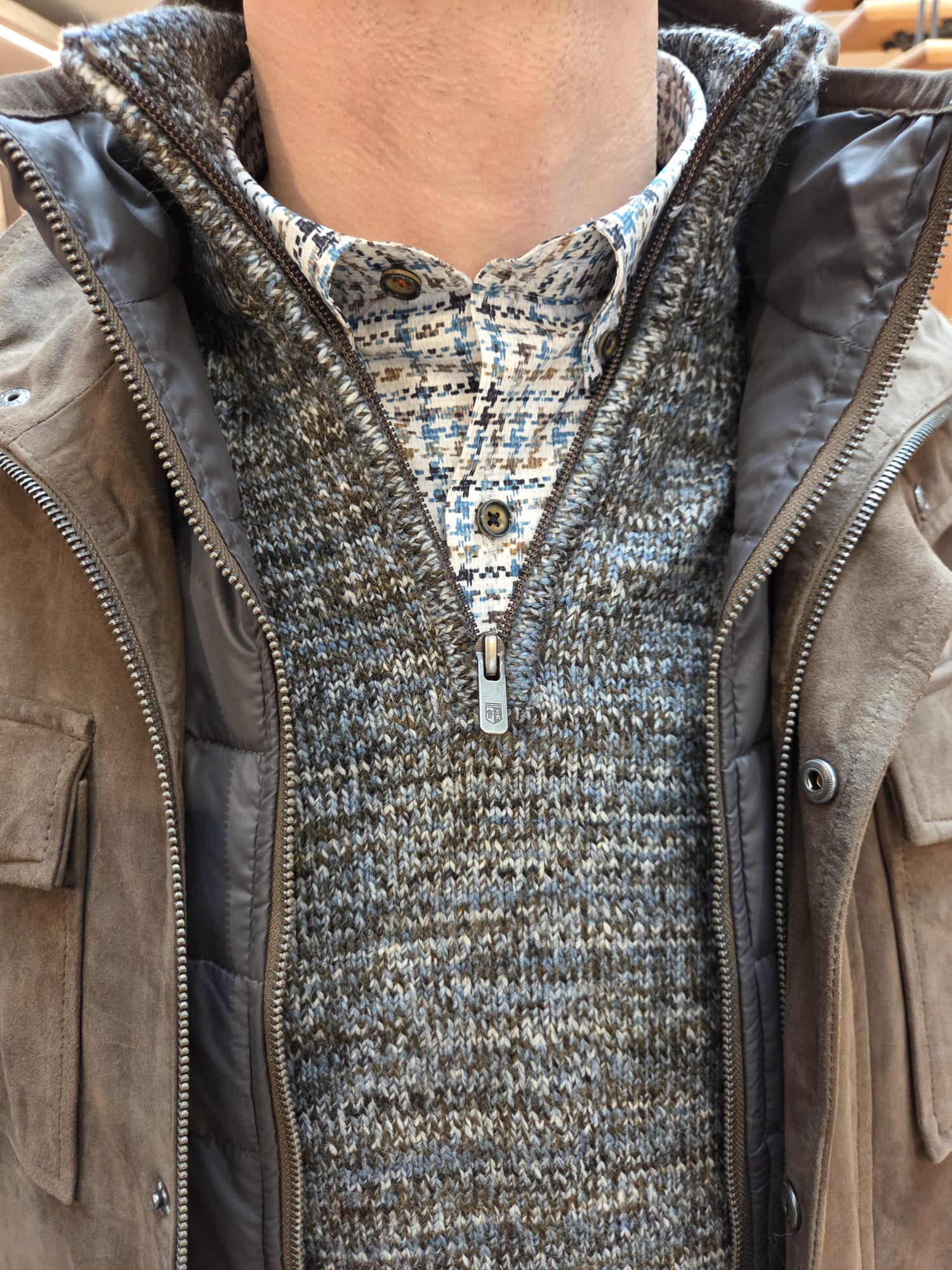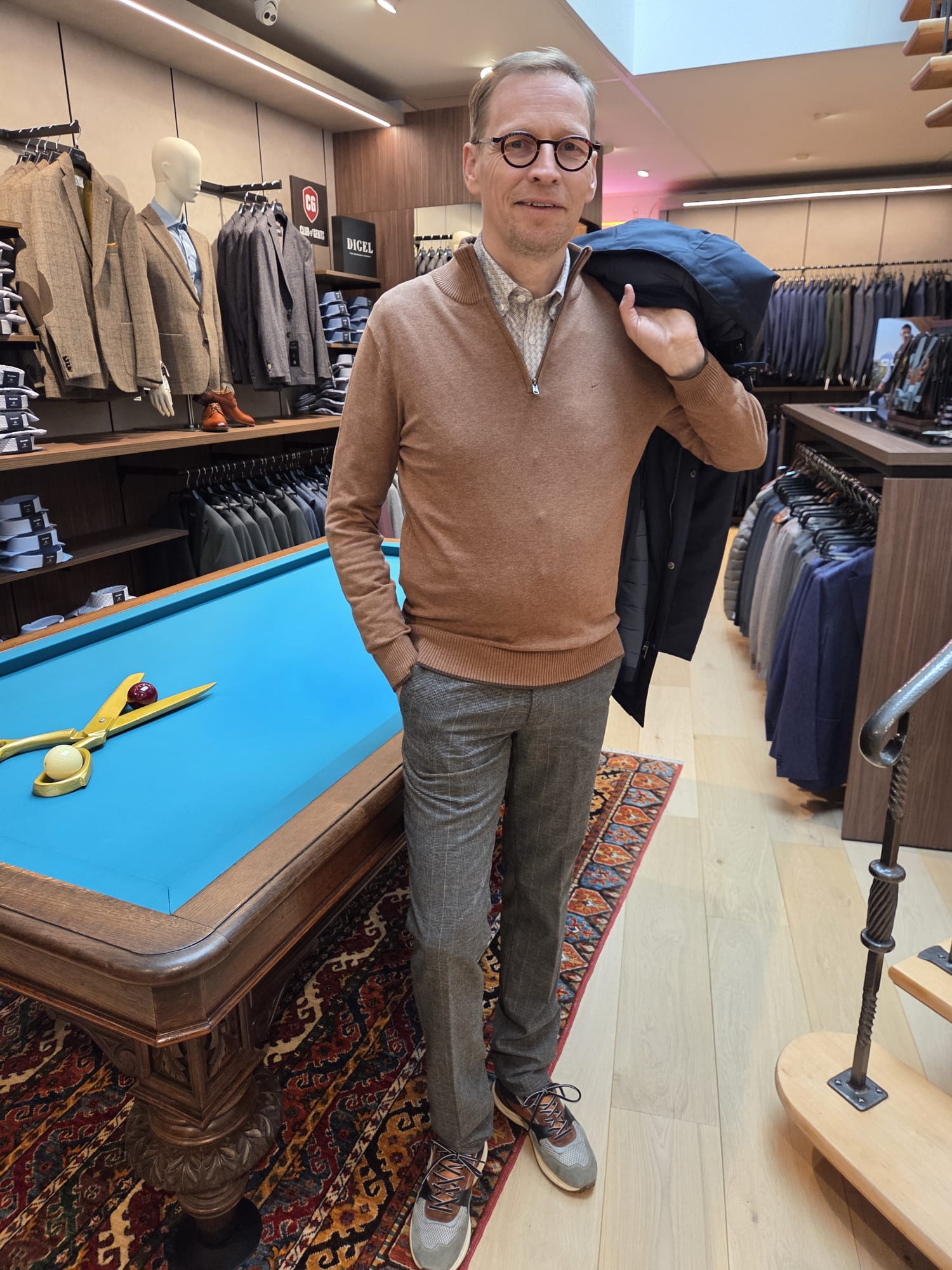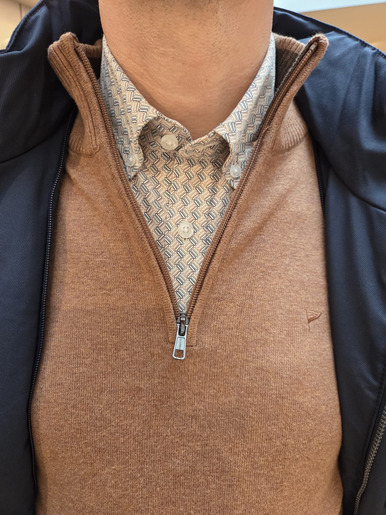 De gemêleerde (gespikkelde) trui met korte rits van State of Art (159,95) kan je dragen met een T-shirt, of zoals op de foto, met een hemd – hier van State of Art (89,95). De broek van M5 (119,95) in mooie bruine herfstkleur pas perfect bij de stoere daim-lederen jas van DNR (389,95).