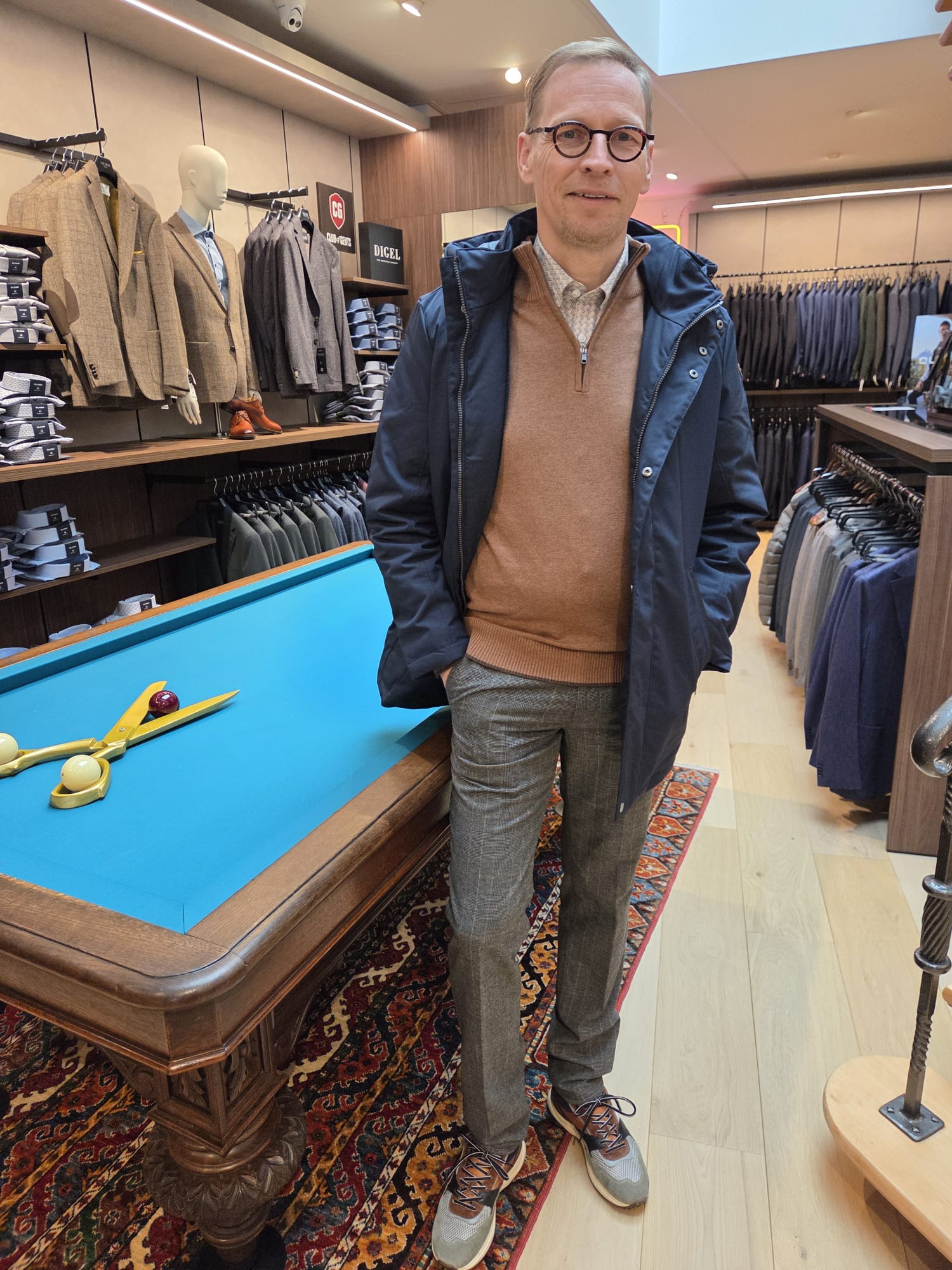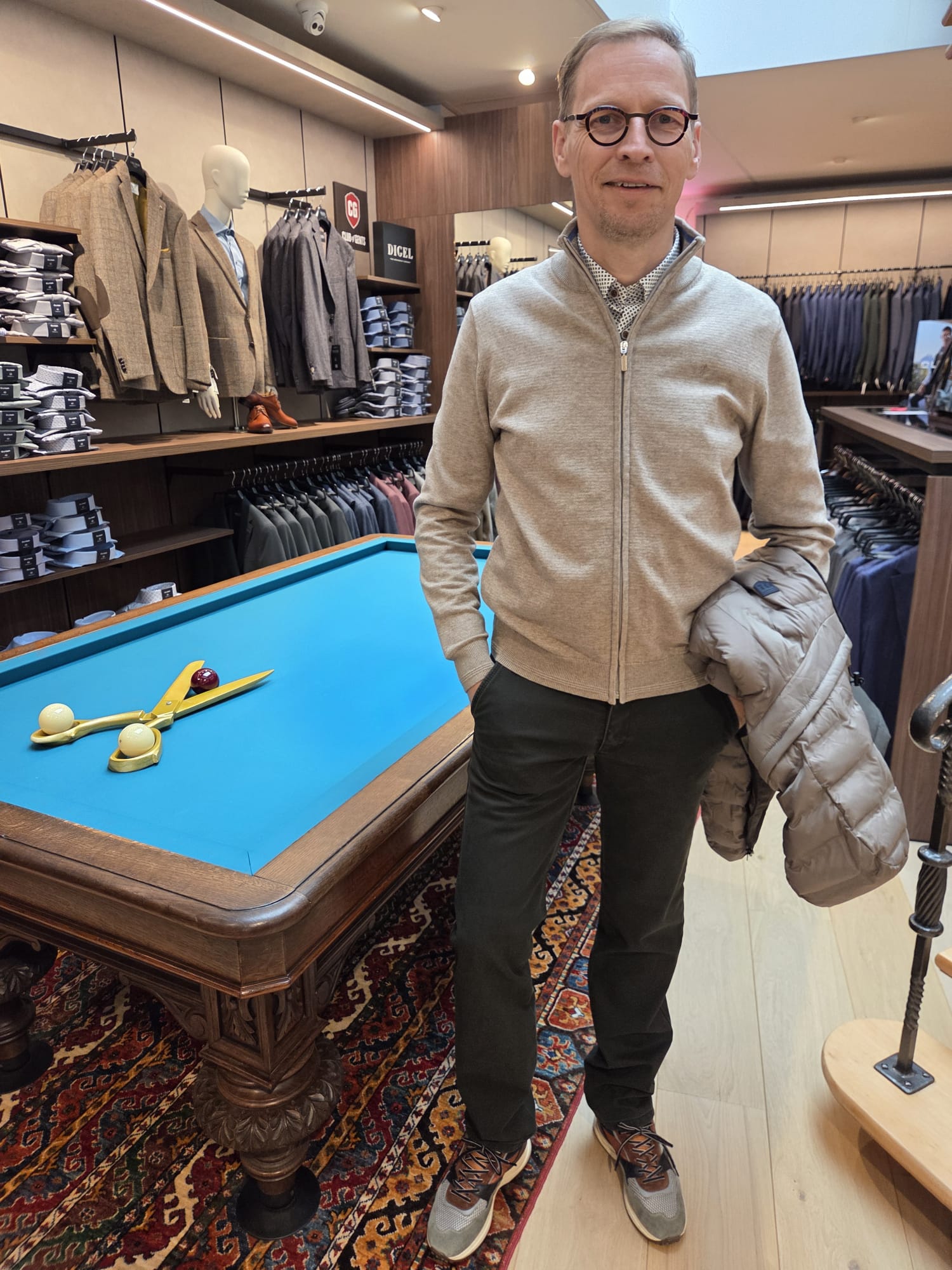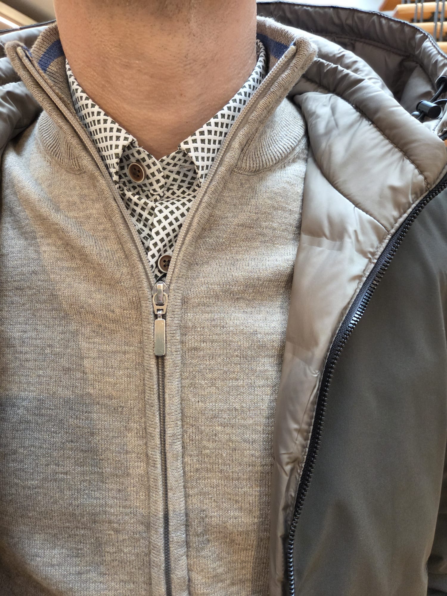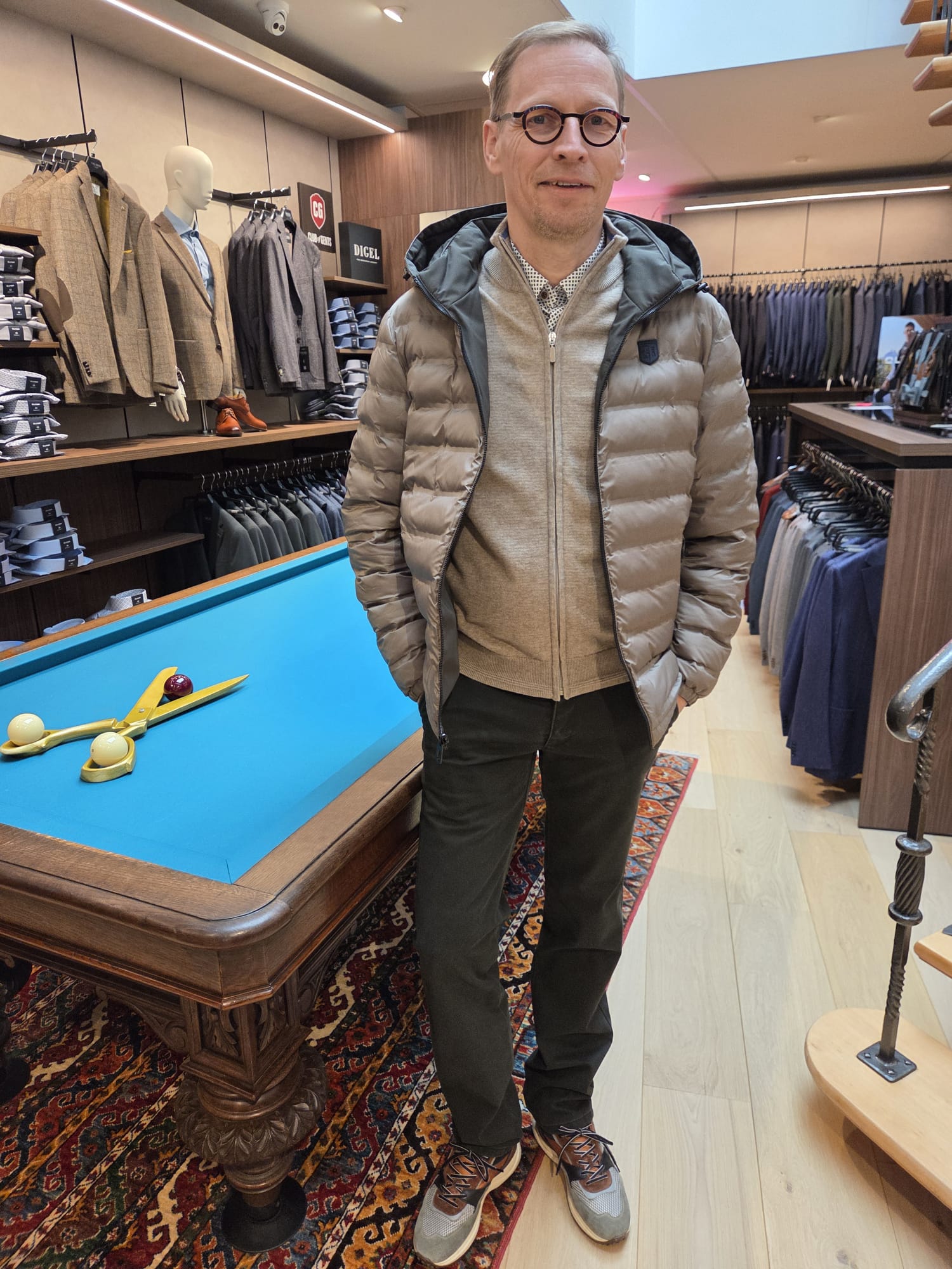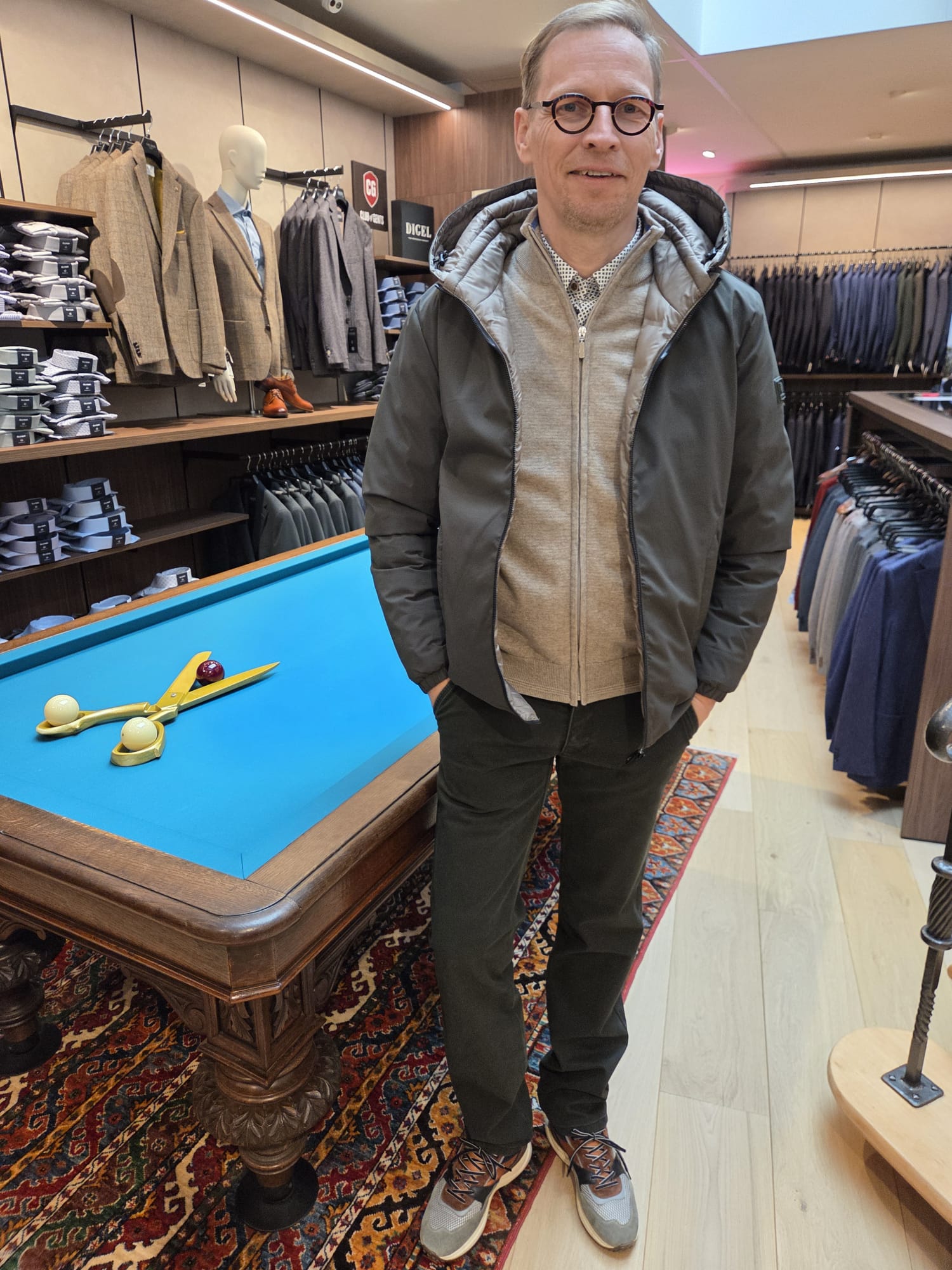 Twee jassen voor de prijs van één? Jazeker, deze jas van State of Ar (279,95) kan je omkeren (je kiest de beige of de kakigroene kleur). Dubbel plezier! Hier hebben we hem mooi gcombineerd met een cardigan (109,95) en een hemd (99,95) van het Belgische label Martin Maple. De broek van Club of Comfort (139,95) is thermisch gevoerd en ideaal voor koude herfst- en winterdagen.