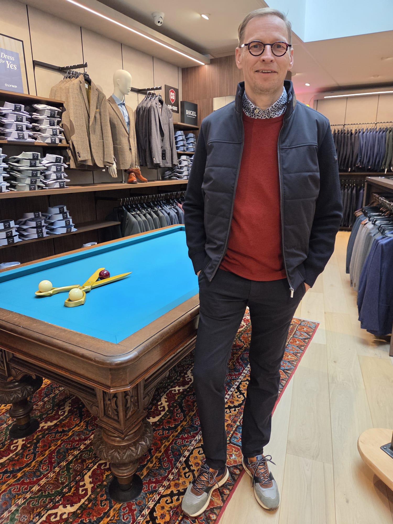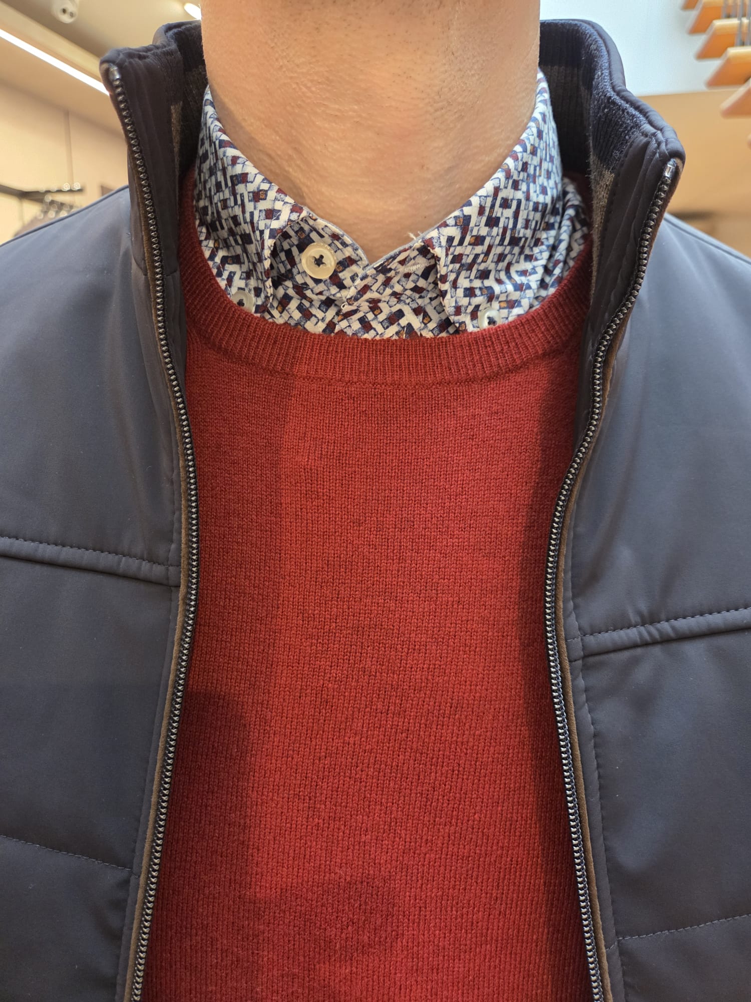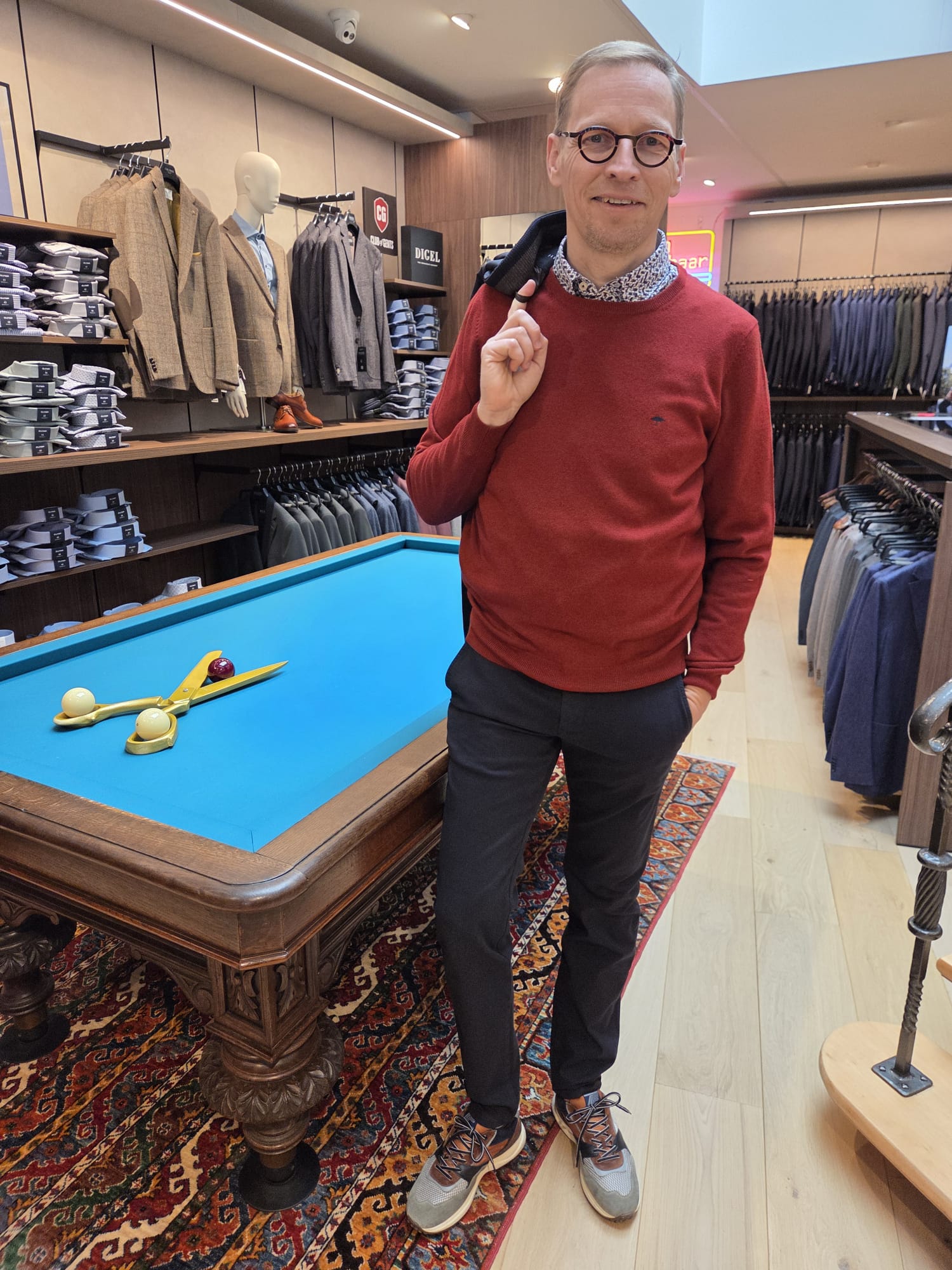 Last but not least: kleur moet er zijn. Wat dacht je van deze combinatie? De rode trui met ronde hals van Fynch-Hatton (99,99) combineerden we met een hemd (69,99) van hetzelfde merk. De jas van Bugatti (289,84) is ideaal als tussenseizoensjas maar kan in de winter ook gebruikt worden als warme cardigan. Onderaan kozen we voor een supercomfortabele broek van MAC (129,95), met een half-elastische tailleband.