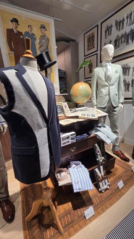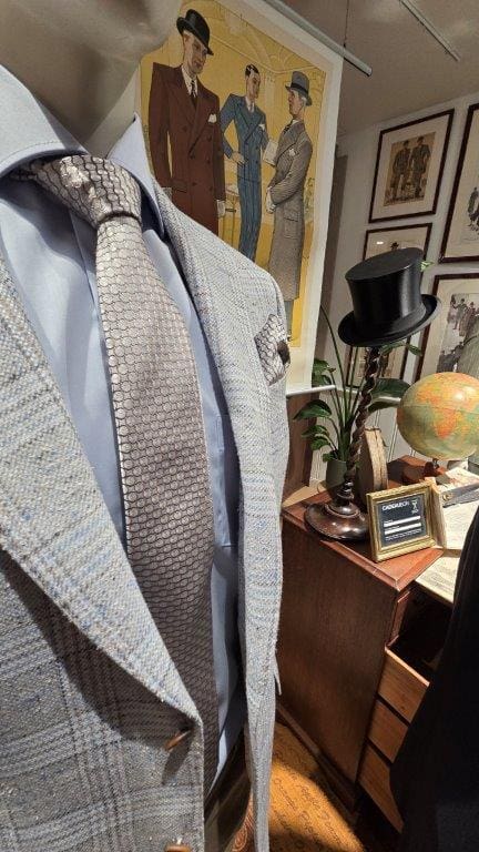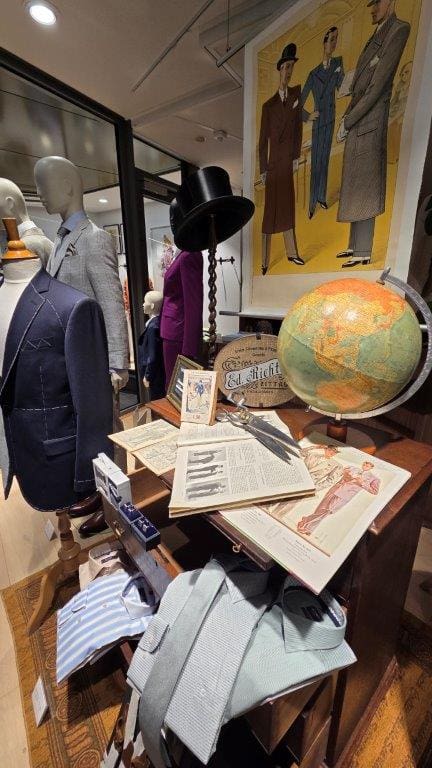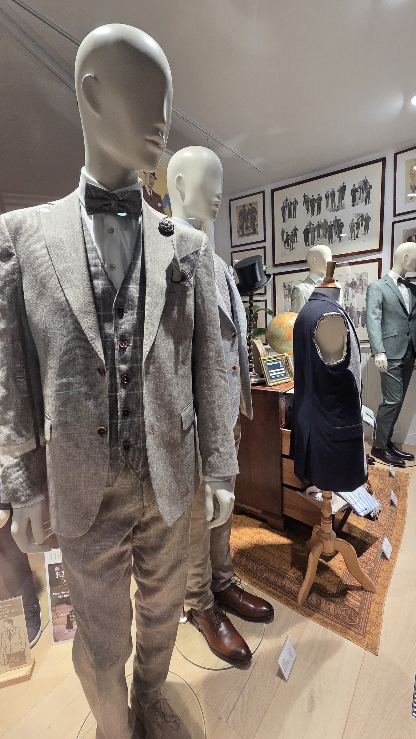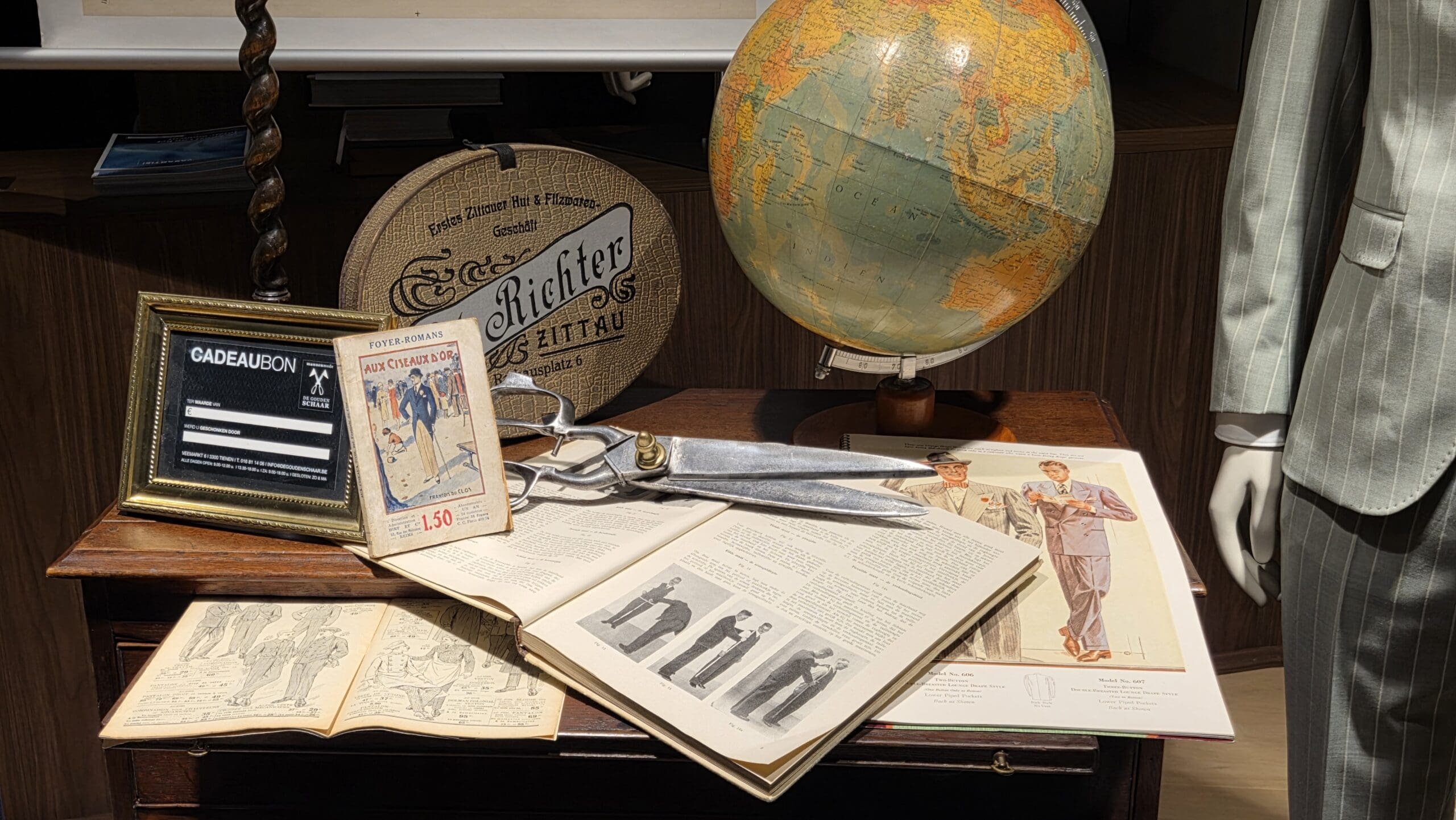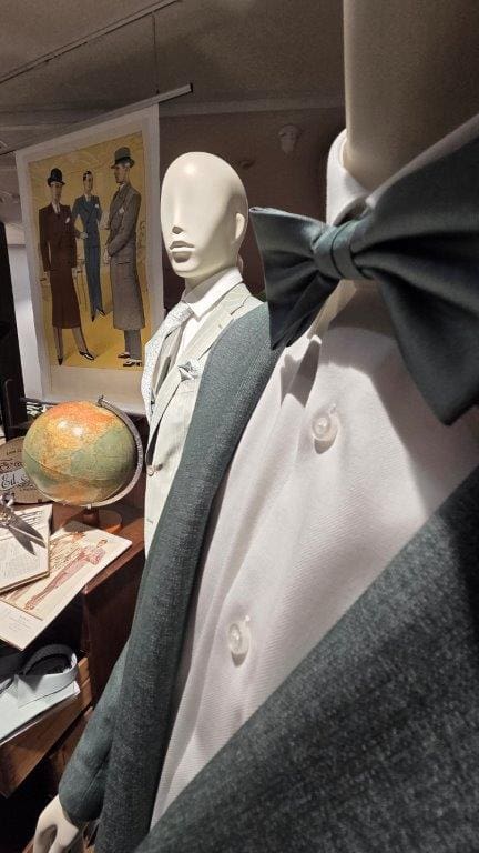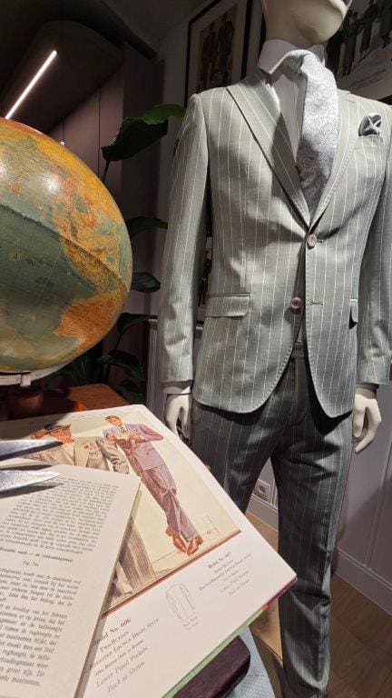 In het rechter etalagevenster keren we bewust terug naar onze roots. Daar kozen we voor een uitgesproken retro-sfeer, opgebouwd rond authentieke attributen die verwijzen naar de rijke geschiedenis van de herenkleding. Oude boeken, stijlvolle prenten, originele scharen, vintage posters en warme houten meubels brengen hulde aan het vakmanschap waarmee De Gouden Schaar in 1926 van start ging. Het geheel ademt traditie, precisie en tijdloze elegantie — waarden die nog altijd de kern van onze werking vormen.
