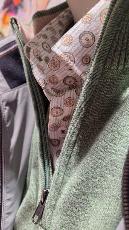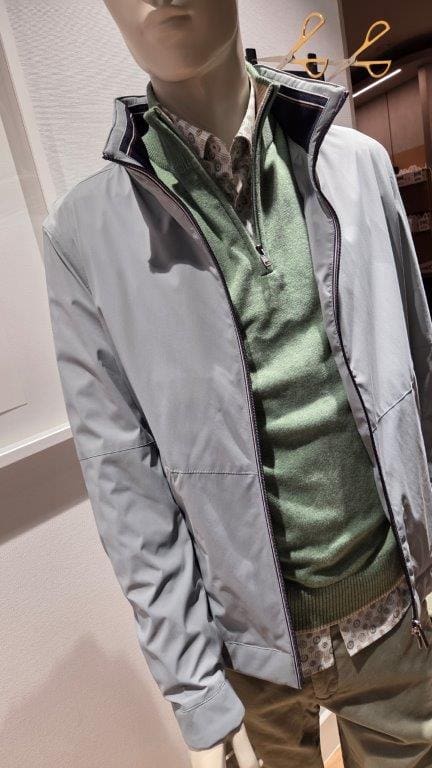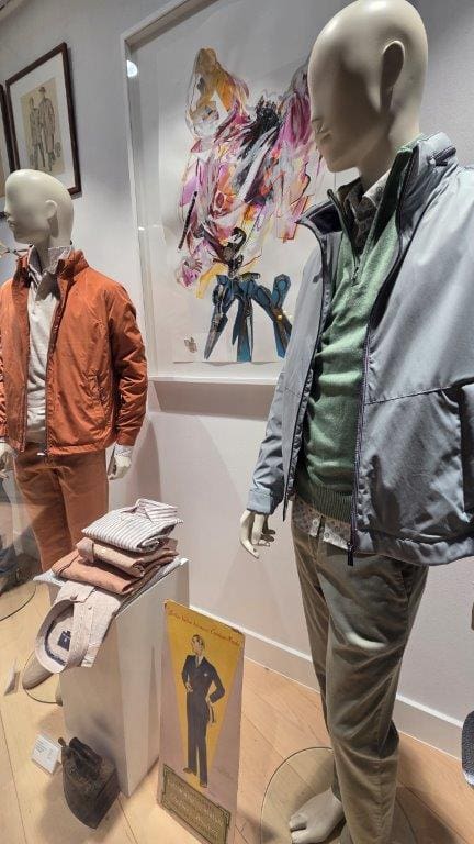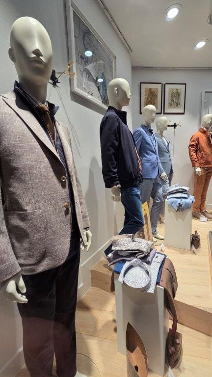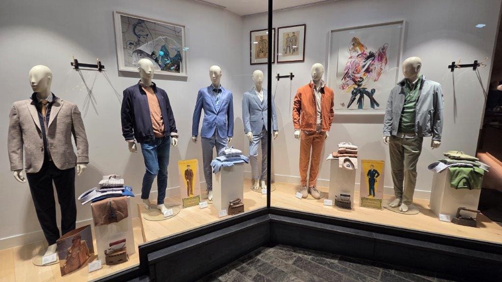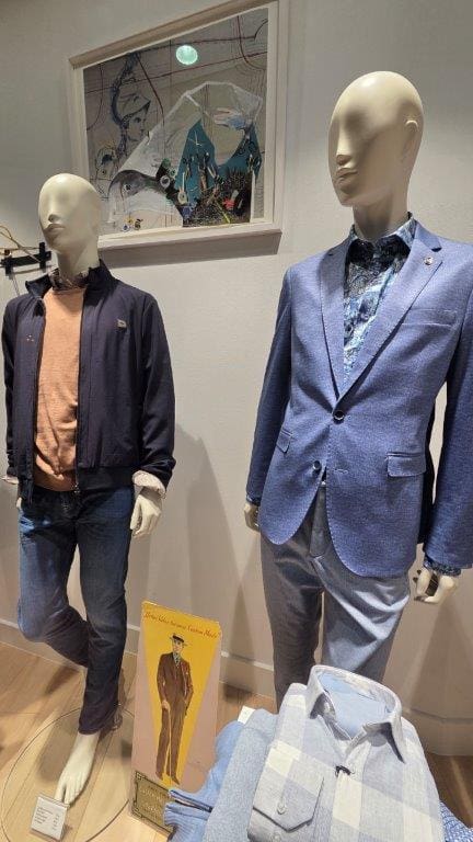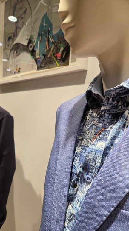 Het linker etalagevenster vormt een krachtig contrast. Hier krijgt de toekomst volop ruimte. De twee moderne kunstwerken die kunstenares Virginie Bailly speciaal voor ons realiseerde, trekken meteen de aandacht en geven de etalage een frisse, hedendaagse uitstraling. Die moderne toets zie je ook duidelijk terug in de gekozen outfits: lichter, dynamischer en perfect afgestemd op de man van vandaag.