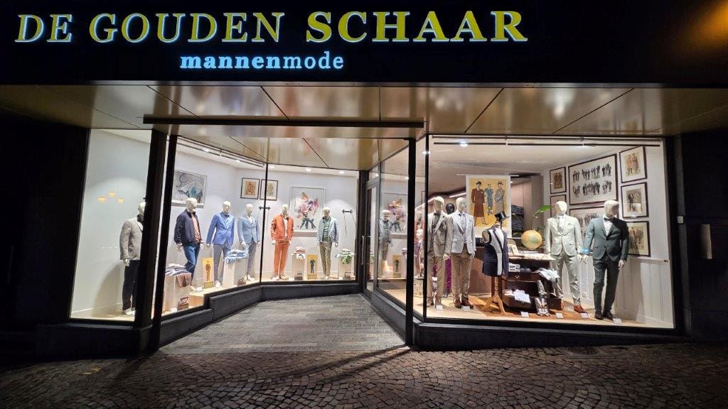 Samen vertellen beide etalages één helder verhaal: 100 jaar De Gouden Schaar is een brug tussen traditie en vernieuwing. Wat in 1926 begon met Pauline Hennebel, leeft vandaag verder in een eigentijdse visie op herenmode en maatwerk.